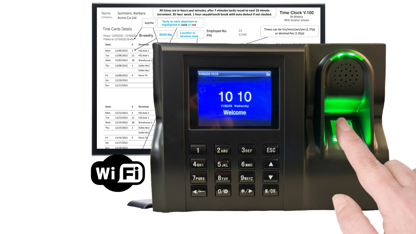 GeoTime 100 Wifi, Time Clock Recorder, Biometric fingerprint. Accurate and Reliable Solution with FREE Export to payroll. 90 days FREE Support. NO SUBSCRIPTIONS. 1 year warranty.