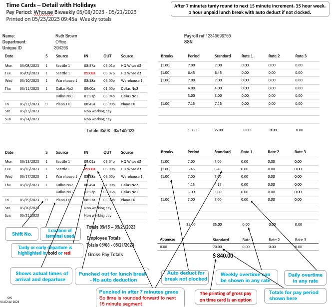 Here is a sample time card for a 2 week pay period. Overtime can be calculated each week if required.